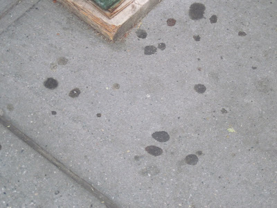 Although most of the time when I am walking in this great city, my eyes are pointed upward toward its wonderful, diverse faces and architecture, every once in a while I look down at the sidewalk.When I do, to my horror, I see t thousands (probably millions, in toto) of "gum dots" that have been spit or tossed on to the sidewalk, stepped on and flattened, and congealed into hard-to-remove black blobs. In some parts of town, these are regularly scraped up by supers and porters and doormen, but in most cased they stay there - I have no idea how they finally disappear.